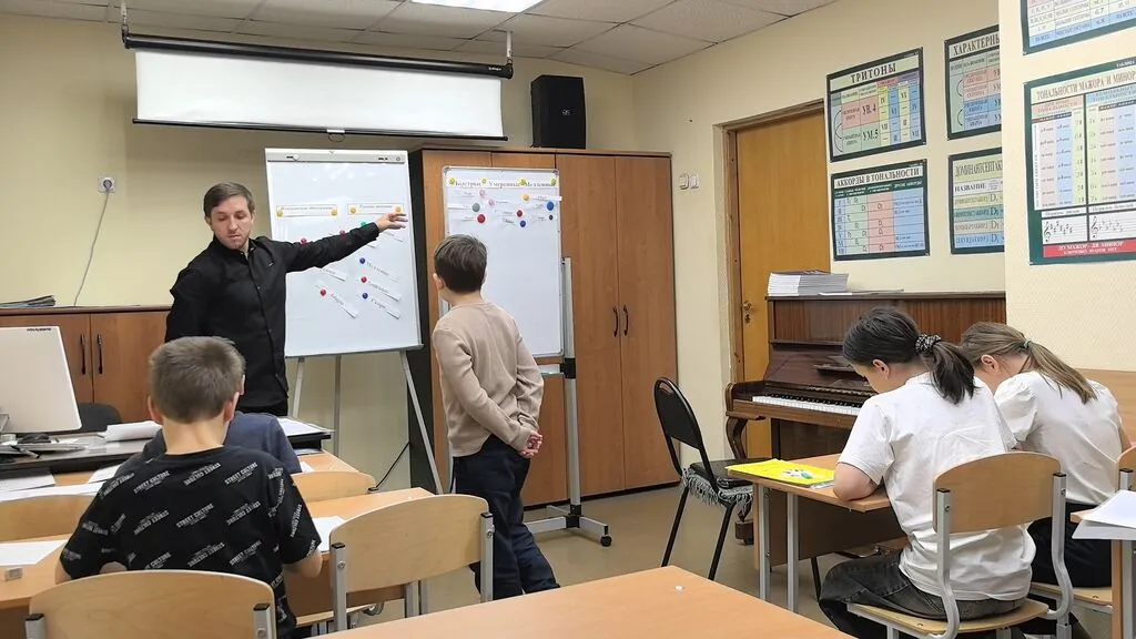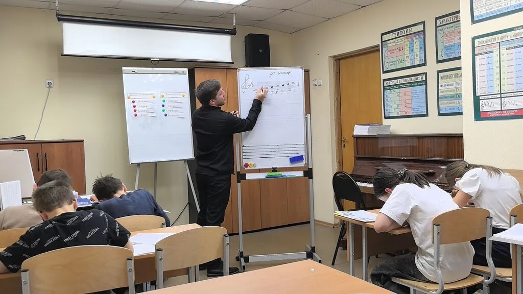 Урок был выстроен методично и насыщенно. Начали с проверки домашнего задания на знание темпов. Ребята работали как по индивидуальным рабочим листам, так и у доски. Затем — увлекательная форма работы «диктант-пазл». Учащиеся уверенно настроились в пройденной тональности и успешно справились с заданием. Финальный аккорд — погружение в новую тональность (до минор). Строили, пели, играли... и заодно отлично повторили, какие бывают виды минора!