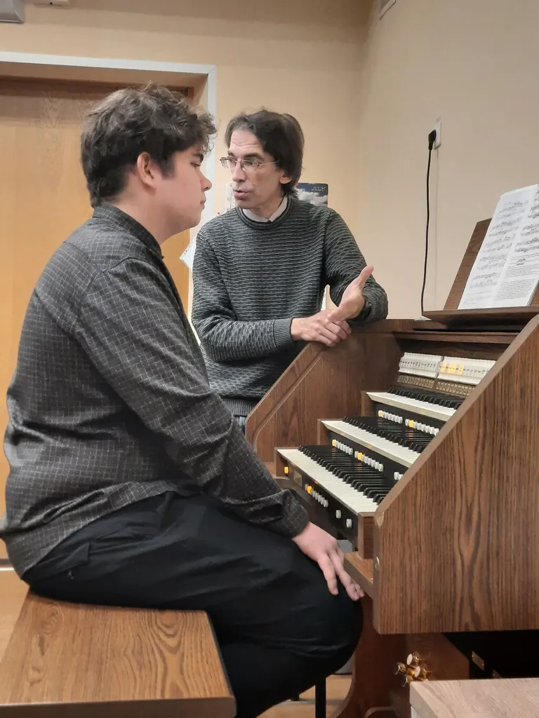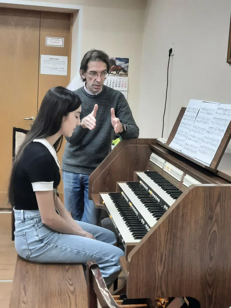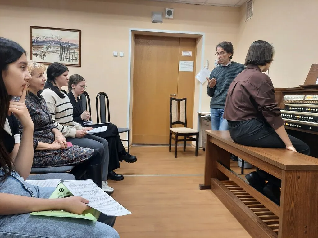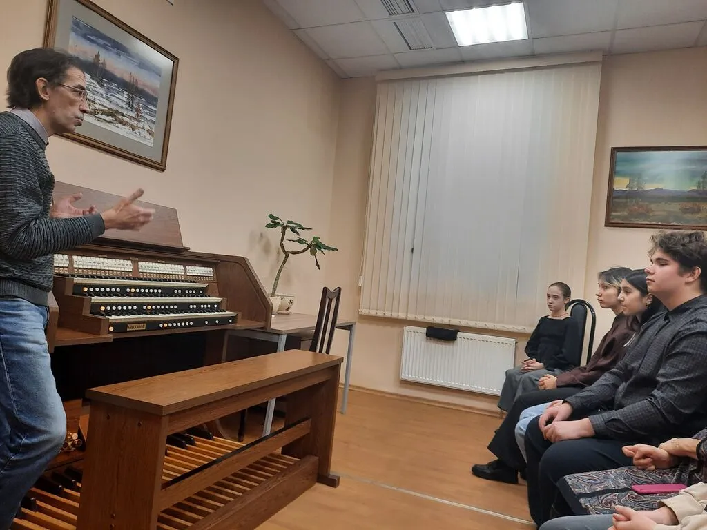 Дмитрий Викторович предложил исполнить выученные произведения на органе. Перед этим он рассказал об устройстве музыкального инструмента, его художественных возможностях, специфике исполнения. Возможность сыграть произведения эпохи Барокко на инструменте, которым пользовались музыканты того времени - полезный опыт для учащихся, позволивший лучше почувствовать звуковую атмосферу этой музыки.